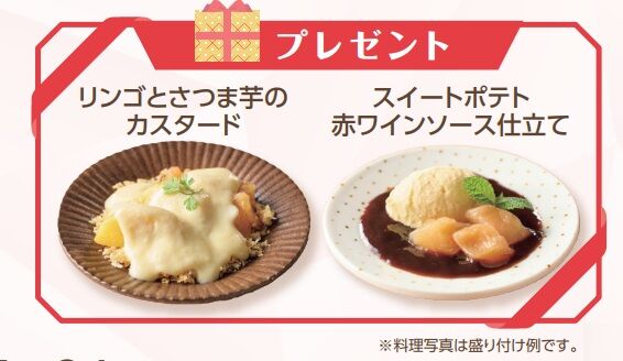 「リンゴとさつま芋のカスタード」、「スイートポテト赤ワインソース仕立て」を各1個プレゼント!